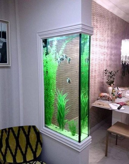 Wall partitions come in many shapes and forms. Instead of a boring old dividing wall, use a large vertical aquarium as a blurred boundary between the two rooms. This can easily turn an ordinary wall into something unique.