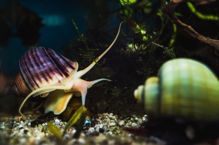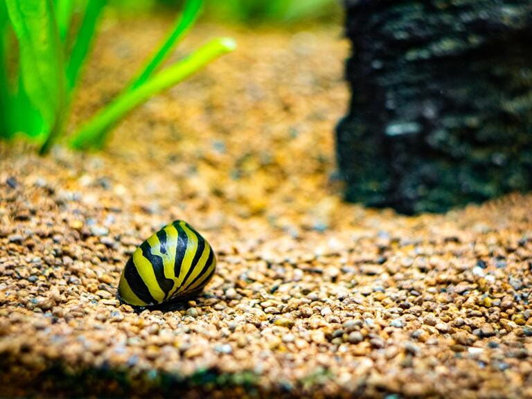 Assassin snails are relatively small and have a beautiful yellow and dark brown striped shell. While they do prey on other snails, they are not aggressive toward fish or shrimp, making them suitable tankmates for most community aquariums.