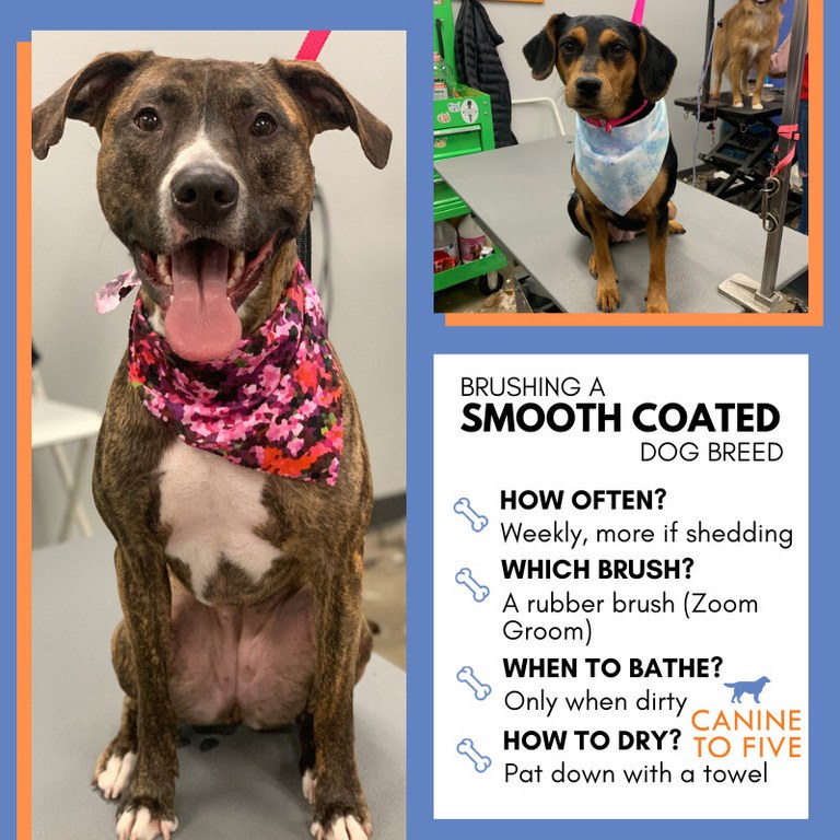 - Brushing short or smooth coats: very suitable for Staffie, Pug or normally fine or short haired dogs, this makes it easy to care for and still keeps the dog's skin and coat healthy, free of dirt, hair loss. You should brush the short hair once a week, but continuous brushing will be better. In general, these brushes are irritating to the coat and skin and can handle any type of hair in the process of molting. Use soft or rubber bristle brushes as they massage the skin, removing debris and frizzy hairs.