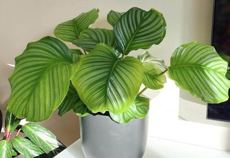 The leaves of this Calathea Orbifolia are relatively large, oval in shape. This houseplant needs partial shade, which makes it ideal for growing plants or shelves in bedrooms that don't get a lot of natural light.
