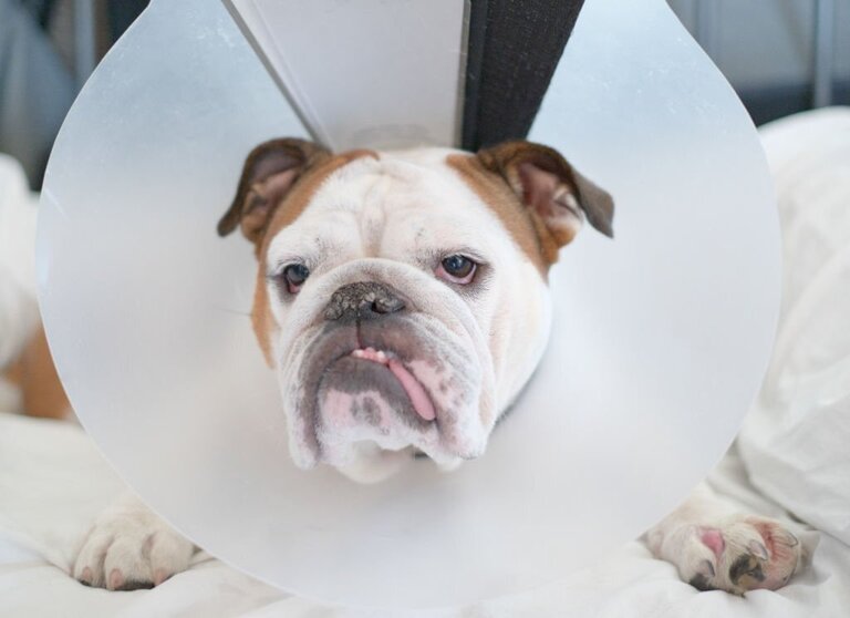 When you're away from home for an extended period, like work or school, it's a good idea to keep a dog wearing an Elizabethan collar so it doesn't get hurt.