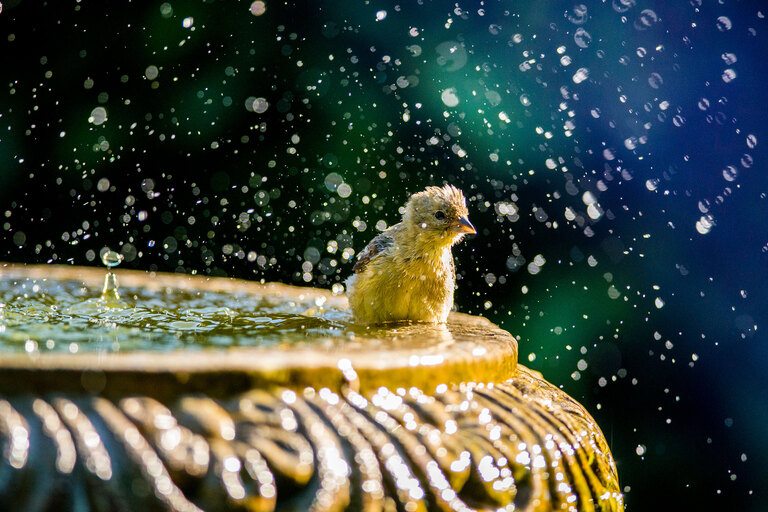 On summer days, add an ice cube to the bird bath. The mass will initially float in the tub but will gradually melt as the day heats up and the water evaporates from the tub. This provides quick relief from heat waves and provides backyard birds with an extra drink or chilled bath.