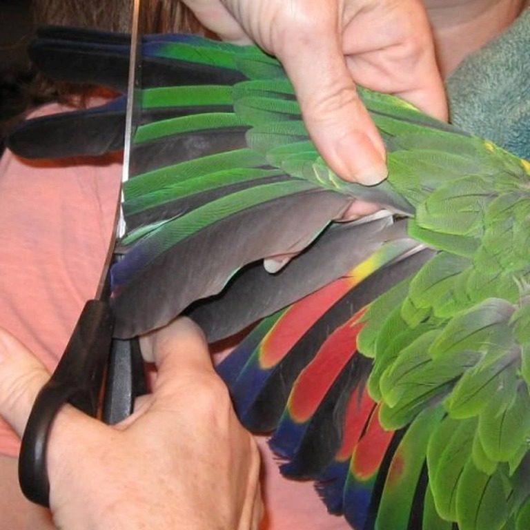 When cutting, trim the feather closest to the tip of the wing. Then clip the main flight feathers about a quarter inch below the shorter, overlapping feathers.